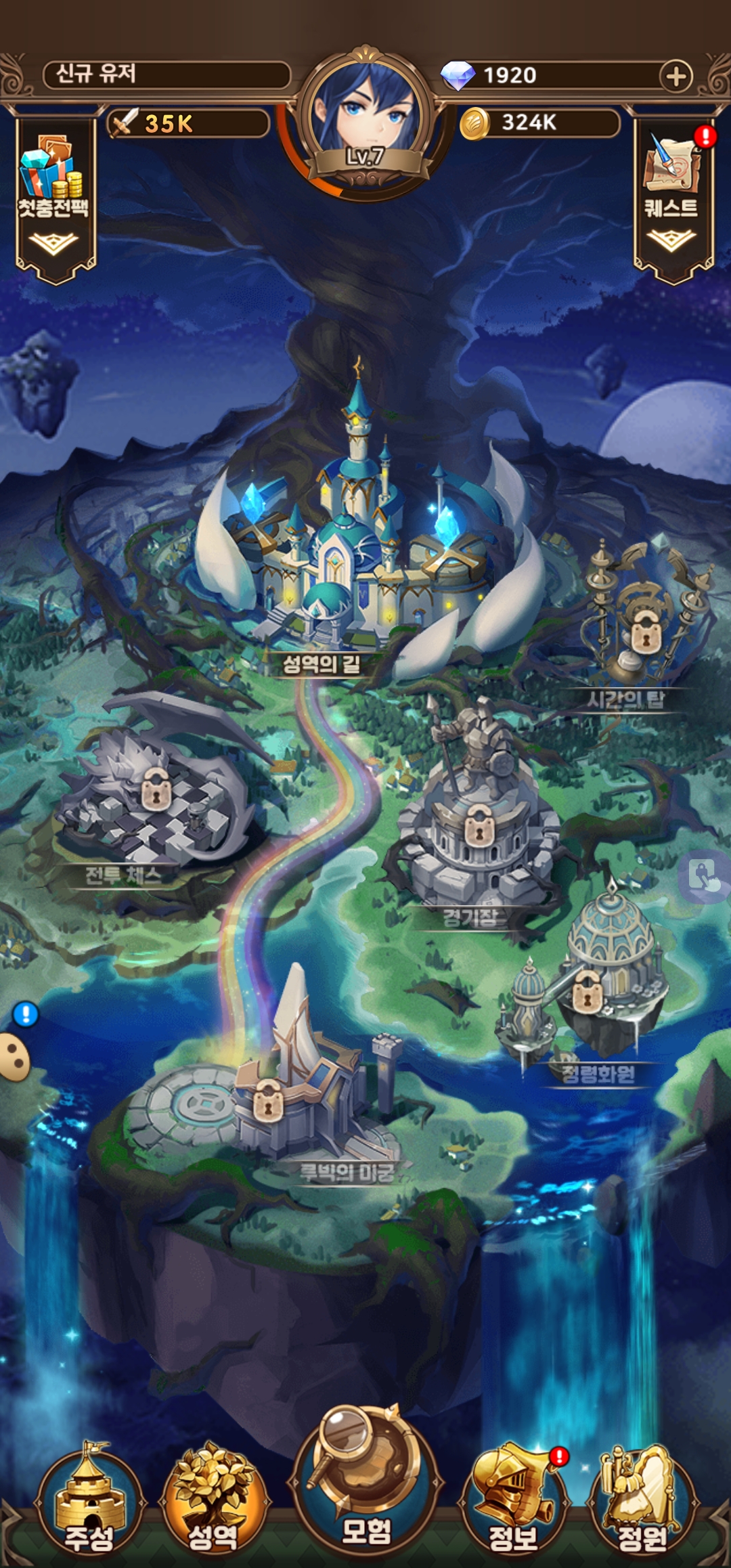 기본적으로 모험, 결투장, 탑(요일던전) 등으로 이루어져 있으며, 마찬가지로 모험이나 탑에서 재화를 수급하여 캐릭터를 성장시키는 메커니즘을 가지고 있네요.