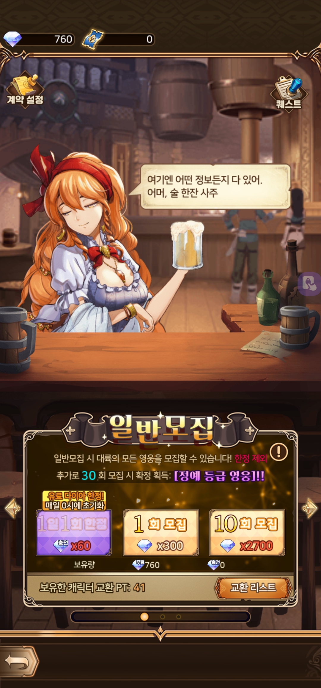 캐릭터 뽑기(고용)의 경우에는 현재 튜토리얼 클리어시 10개, 사전예약 10개, 1스테이지 완료시 10개 수준으로 솔라 리바이벌 리세마라를 위한 30연뽑 정도는 10분안에 가능한 상황이니 참고하세요.