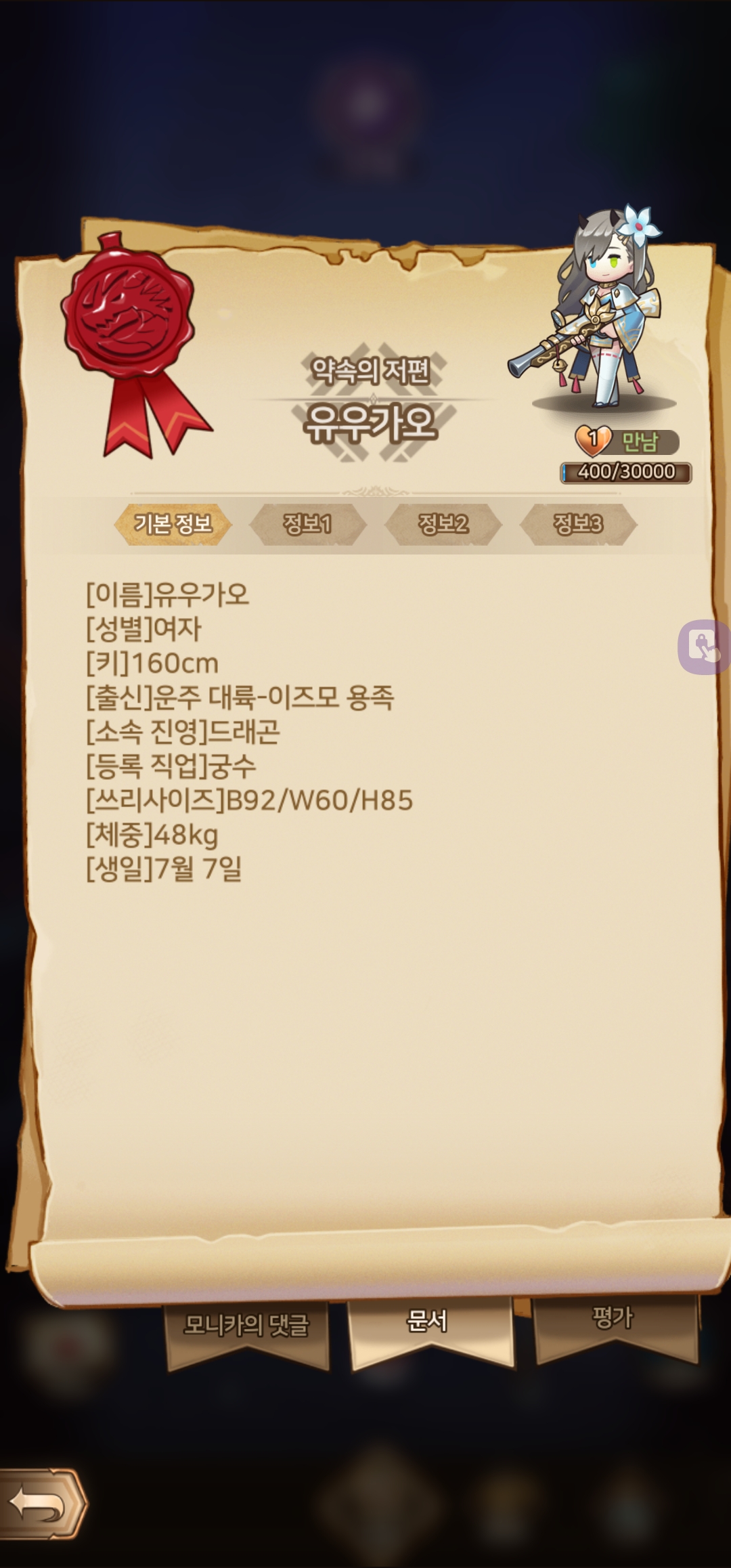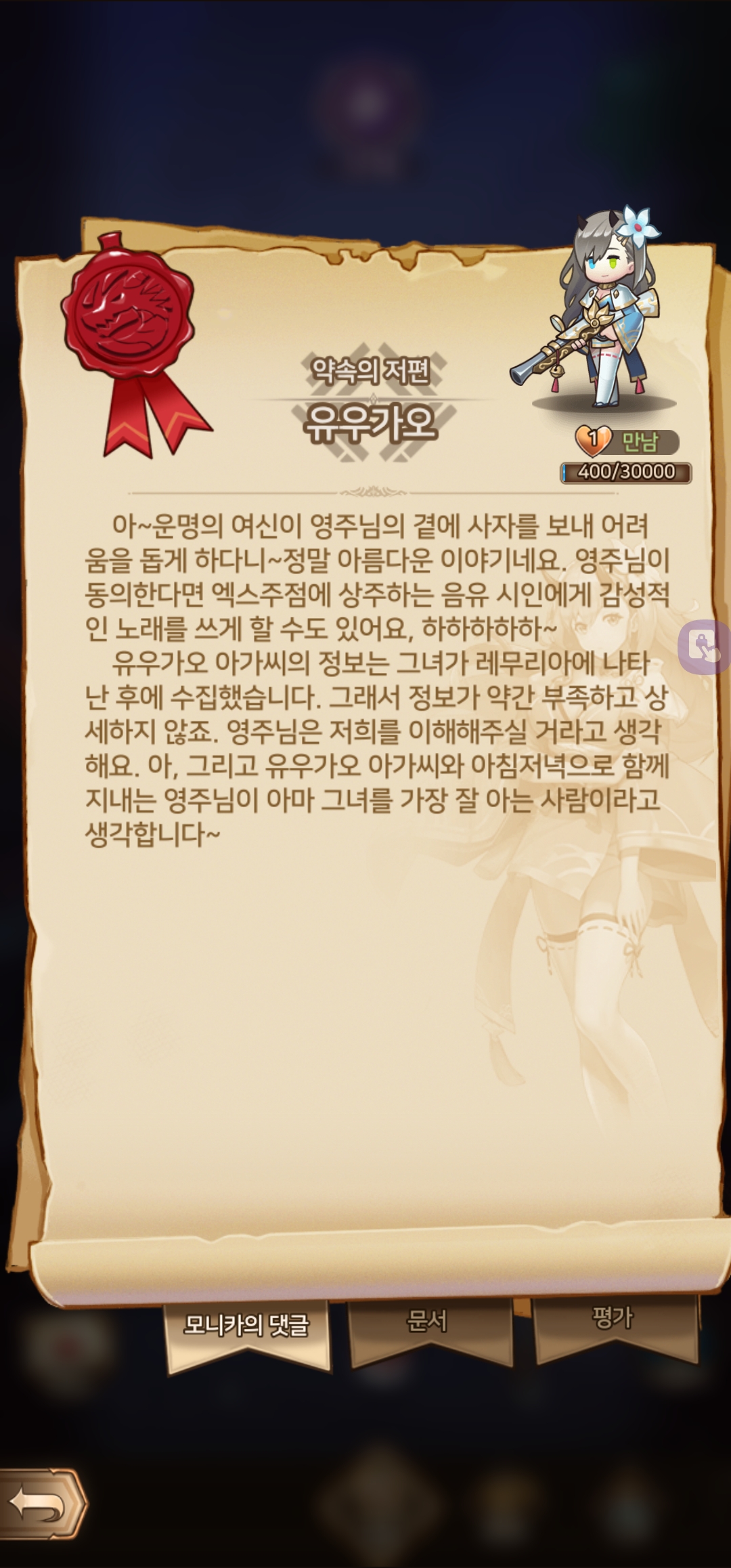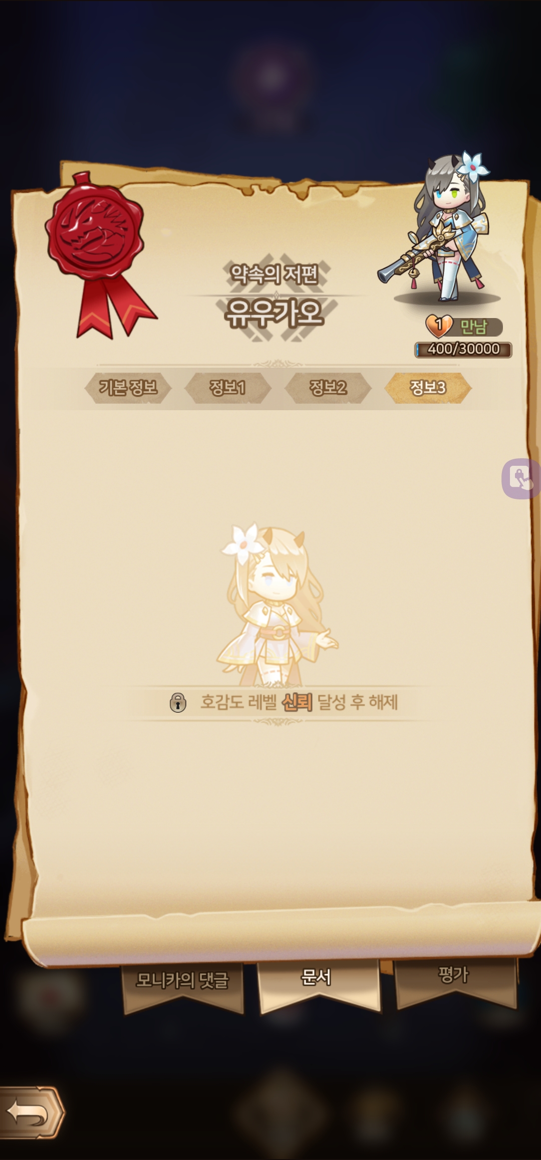 그리고 내가 출전시키는 캐릭터들로 전투를 이어갈시 호감도가 조금씩 상승하게 되는데 일정 부분 이상 넘어가면 캐릭터에 대한 상세한 프로필(?)과 추가 이야기들이 열리게 되니 이부분도 참고하시면 좋을 것 같네요 :)